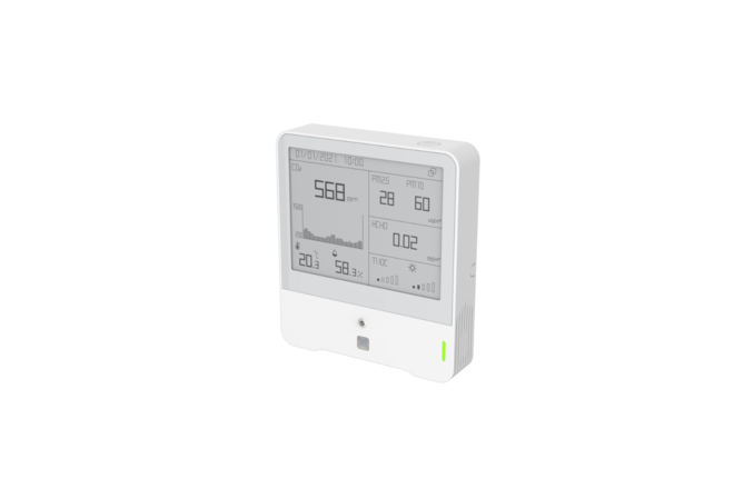 AM319 is a compact indoor ambience monitoring sensor for measurement of temperature, humidity, light, CO2 concentration, HCHO/O3 level, TVOC, barometric pressure, PM2.5, PM10 and motion. The data will be shown on the E-ink screen in real-time, which helps to
